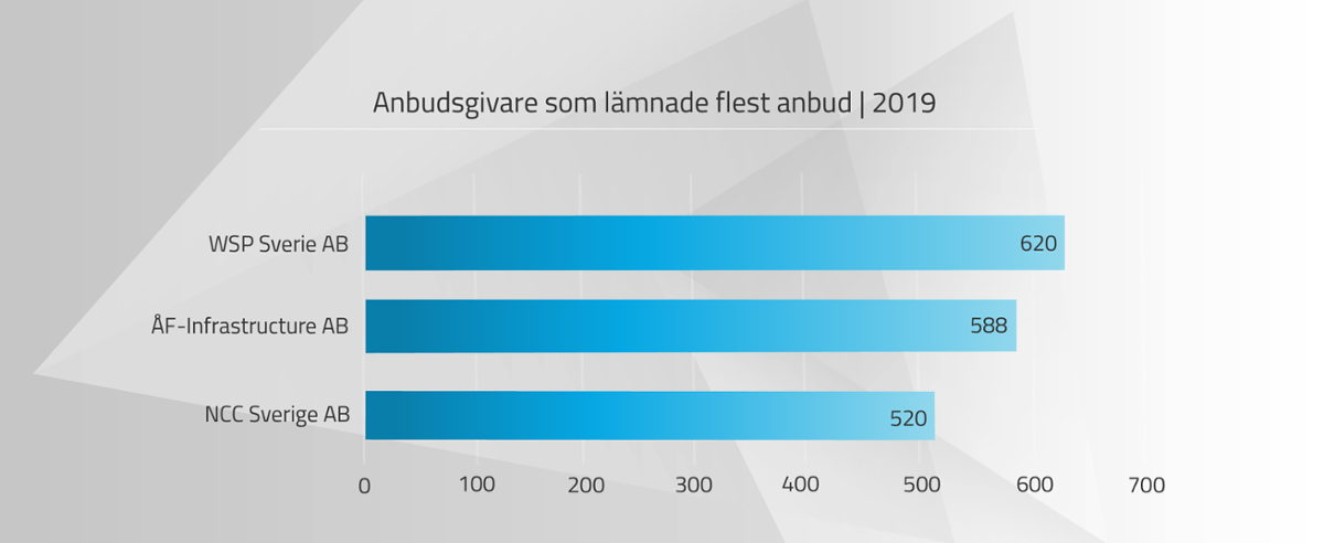 Det företag som lämnade allra flest anbud 2019 var WSP Sverige AB. Hela 620 anbud skickades in av den hurtiga organisationen WSP. Inte långt efter kommer ÅF-Infrastructure AB med sina 588 anbud och på en fin tredjeplats kommer NCC Sverige AB, med 520 anbud.