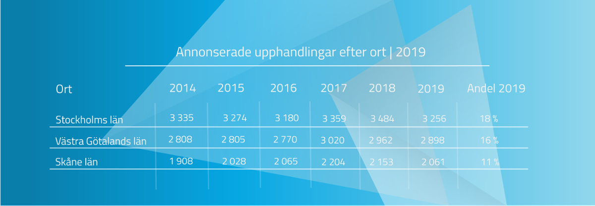 En enskild upphandling kan ha fler än en upphandlingsort och av samtliga upphandlingar som levererades 2019 hade hela 45 % något av de tre ovanstående länen som leveransort.
